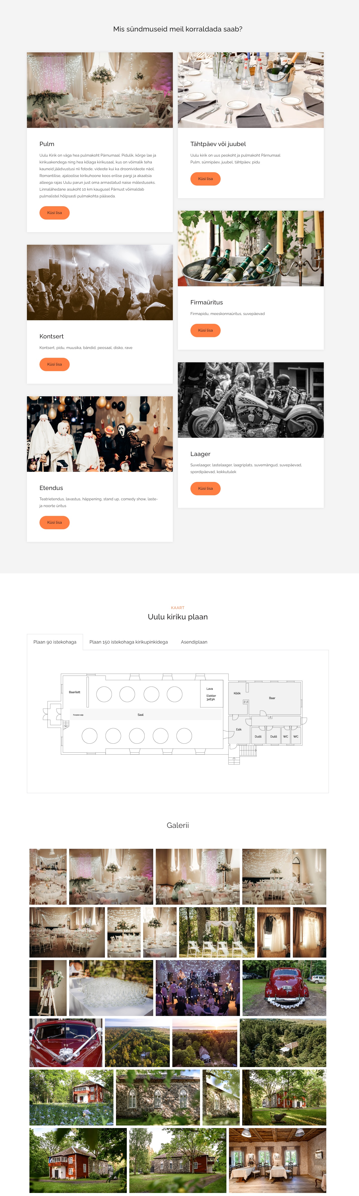 Pärnu lähedal asuvas ajaloolises Uulu kiriku kultuuri- ja puhkekülas saab korraldada kontserte ja etendusi, pidada pulmi, kokkutulekuid ja juubeleid ning ettevõtete ja organisatsioonide sündmuseid.